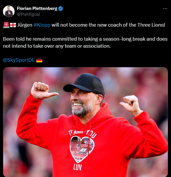 德国天空报记者普拉滕贝格表示,虽然英格兰队正在努力追求前利物浦主帅克洛普,但他本人却无意执教英格兰队。