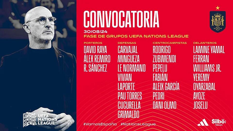 10月16日讯欧国联A联赛第4轮,西班牙主场对阵塞尔维亚。赛前,官方公布了本场的首发名单。