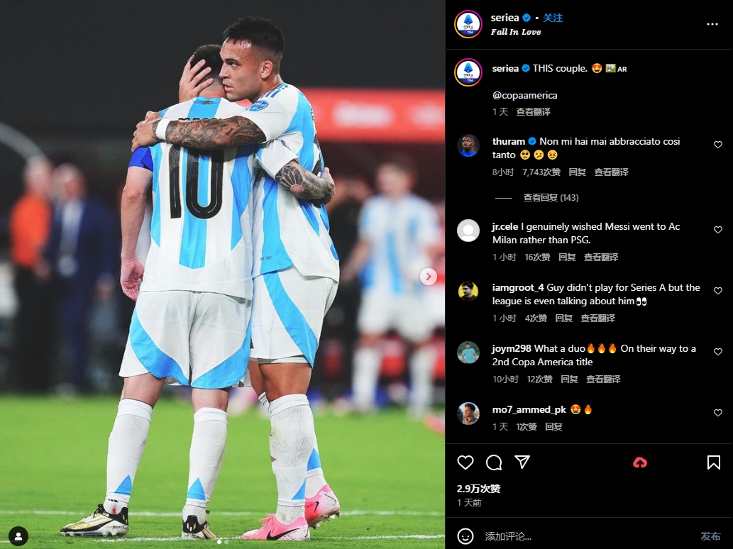 意甲官方社交媒体晒出了梅西和劳塔罗在场上拥抱的照片,并调侃道:“这对情侣相爱了!”
